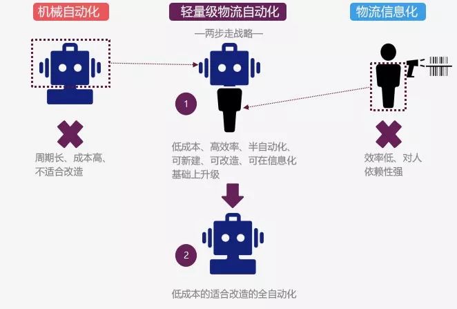 因此,为解放人们的大脑和双手,利用物联网技术,打造物流系统的互联互通,华清科盛研发的“轻量级物流自动化”技术处于物流信息化和机械自动化之间,可分为两步走战略。