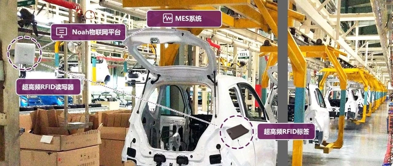 在汽车工厂的生产流水线上,在制品车每次流转到关键工位,会触发超高频RFID读写器,读写器读取车身上RFID标签信息,并将信息传给Noah物联网平台,Noah物联网平台再与上层MES系统信息交互。
